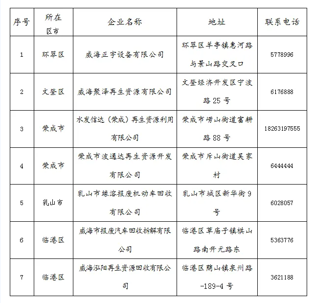 威海市回收拆解企业信息: