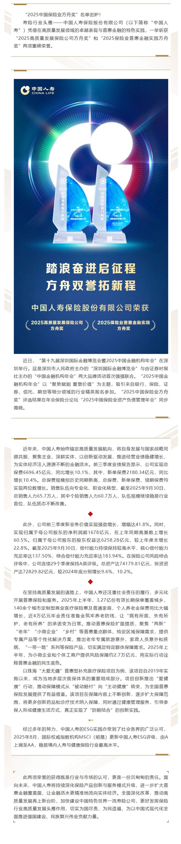 方舟奖揭晓!中国人寿斩获高质量发展与普惠金融实践两项大奖