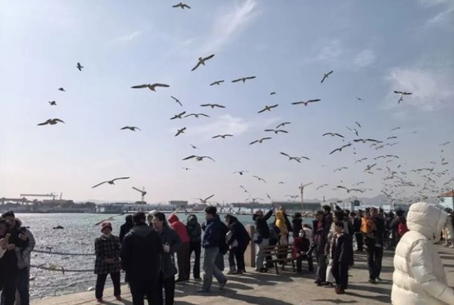 来自重庆的汪先生一家四口将串着天鹅食的竹签高高举起,每当海鸟啄走手中的食物,便发出一阵惊喜的叫声。“太好玩了!刚才妈妈手里的面包被叼走了。”孩子的笑声在海风中飘荡。妈妈李女士笑着说:“这趟不仅大饱眼福,跟海鸟的互动更是有趣,太喜欢这种人与自然交流的感觉了。”